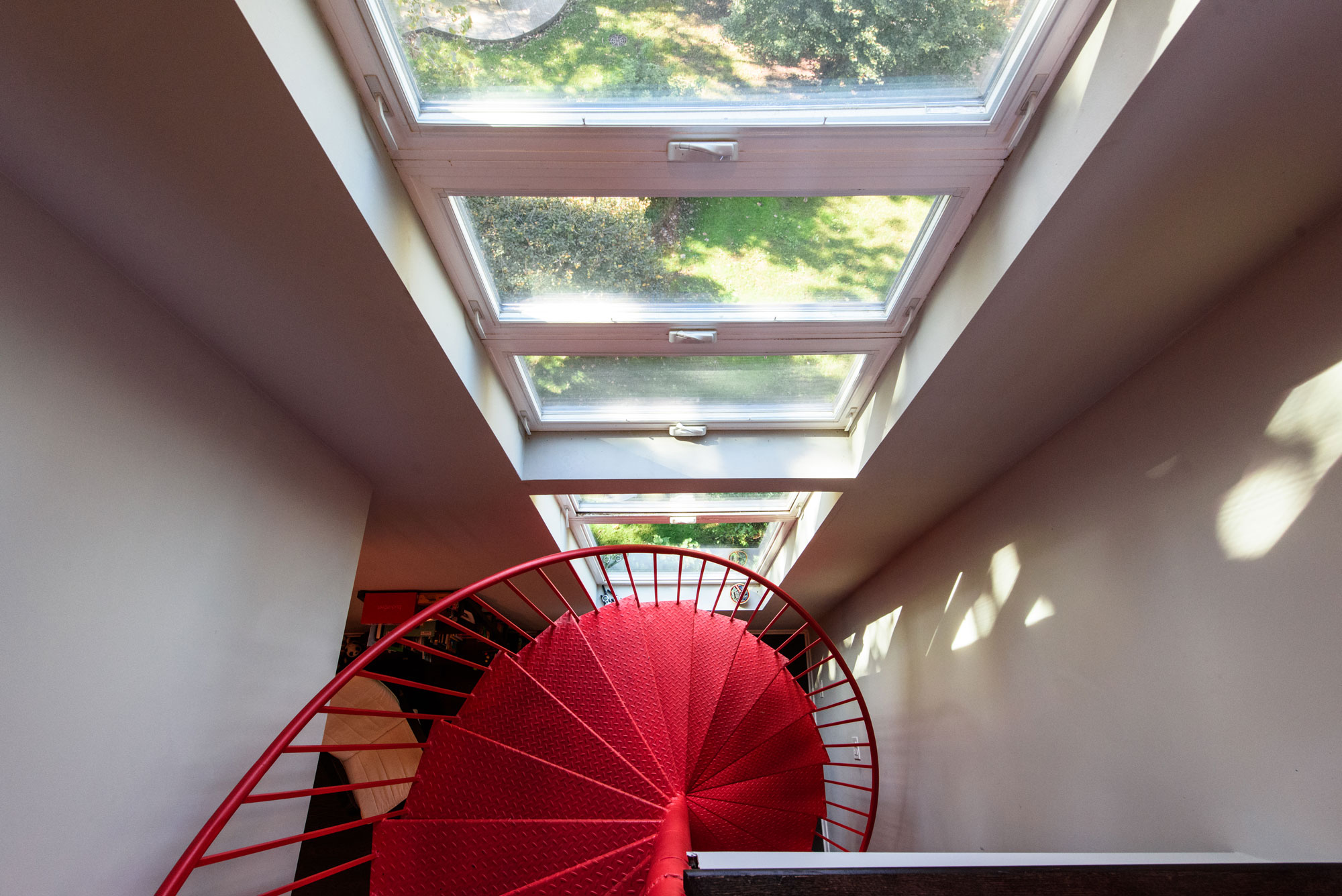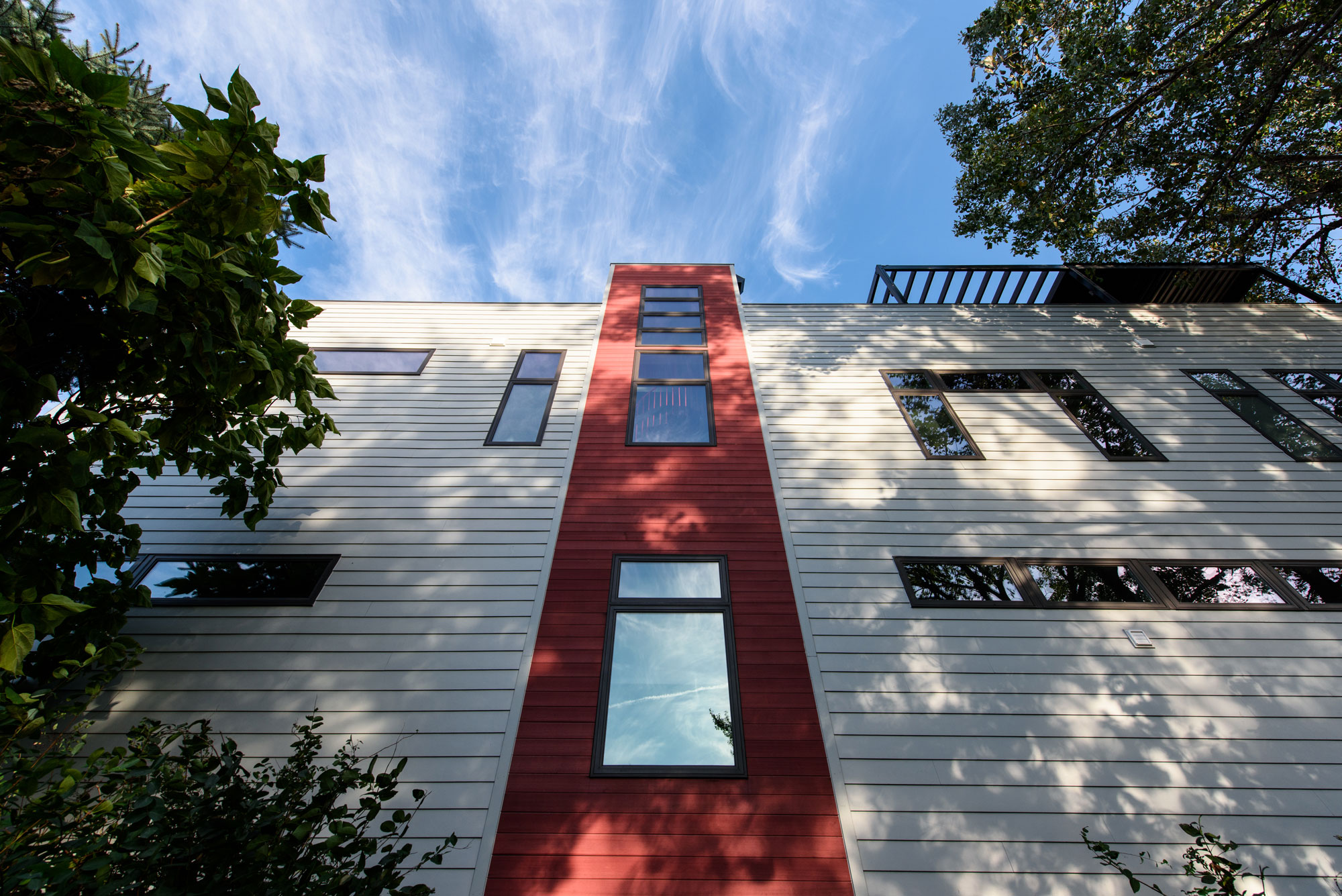 The 2-unit residence accommodates one family on the two upper floors, and provides a rental unit on the garden level. Balance between open and enclosed space is established by a rooftop deck at the top of the building, a street side patio at the garden level and a private rear deck and yard.