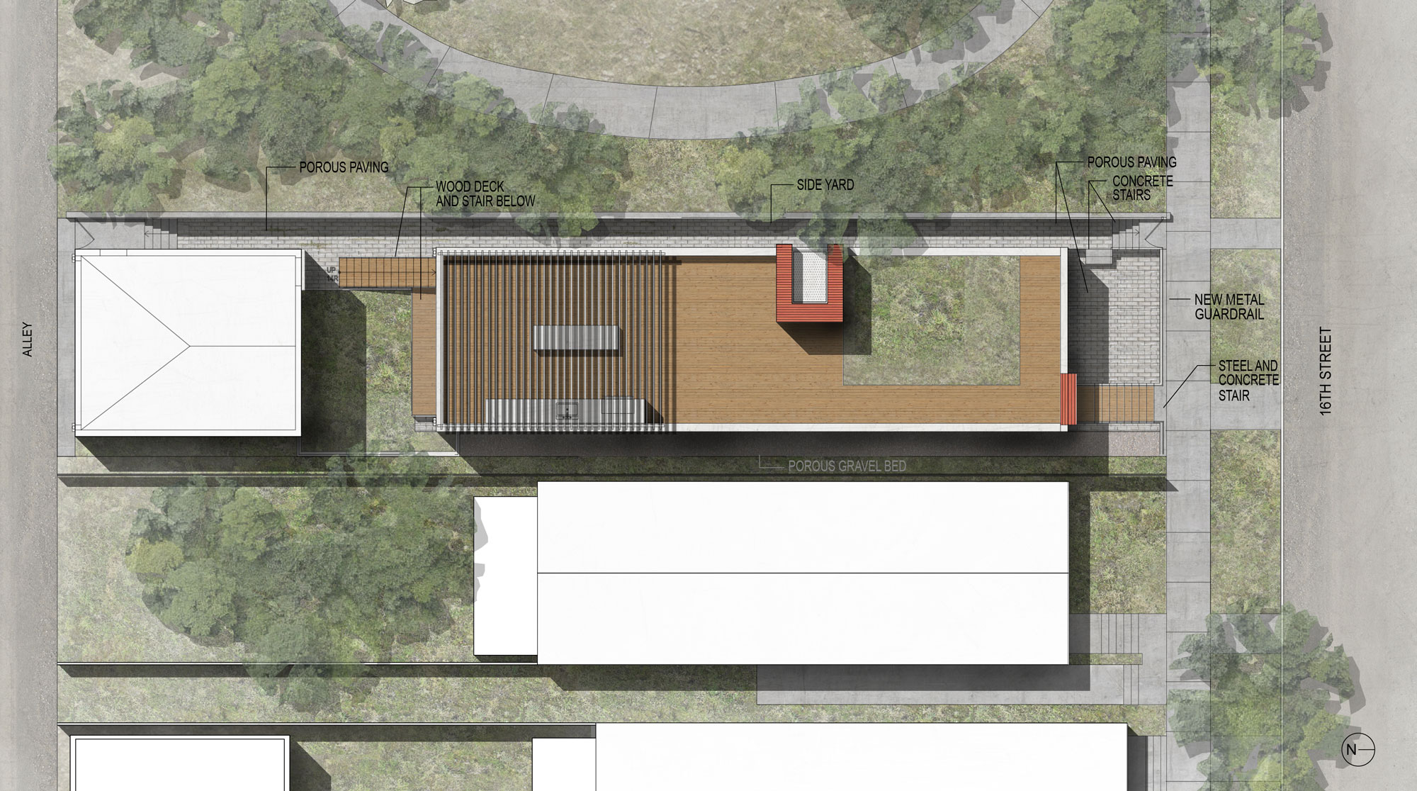 The environmental approach is to use every exterior horizontal surface as a porous membrane to allow rain runoff to slowly percolate back to underground stormwater management systems. Inside, activity is centered around the kitchen for both units. Natural lighting, ventilation and thermal control serve as the organizing tools for both mechanical systems and fenestration, expressed visually through a set of wooden bays. The exterior palette is simple, inexpensive and easy to maintain with wood rain screens, finished cement board and aluminum rain screen panels. All exterior materials are manufactured continentally and meet LEED Homes criteria. Through its design, 1111 will serve as a catalyst for an affordable, modern, green home for many years to come.