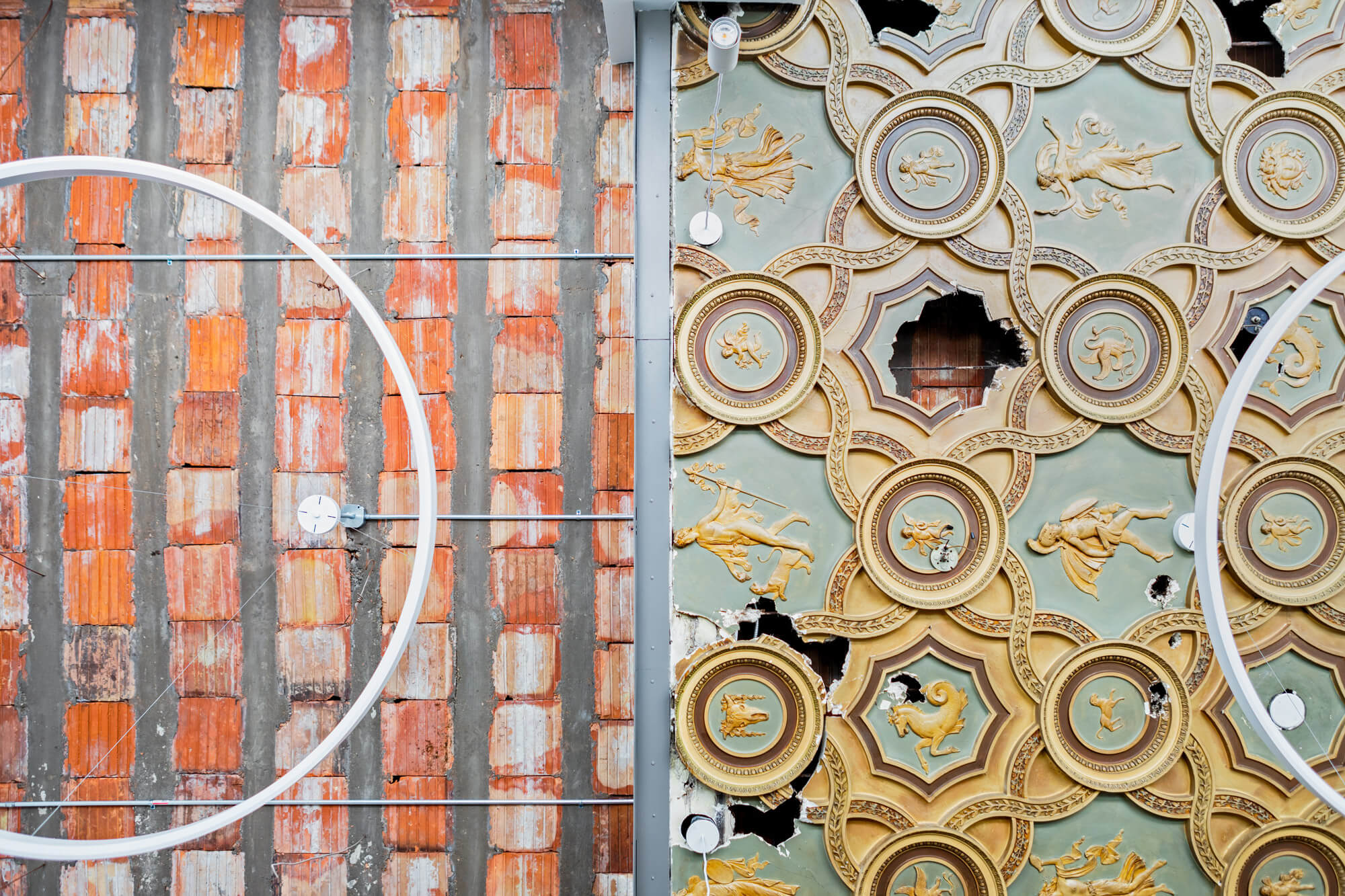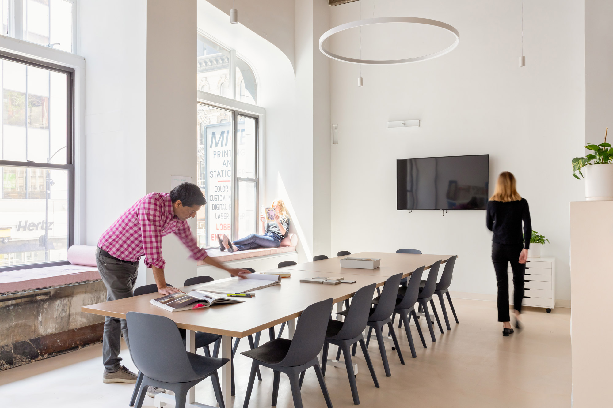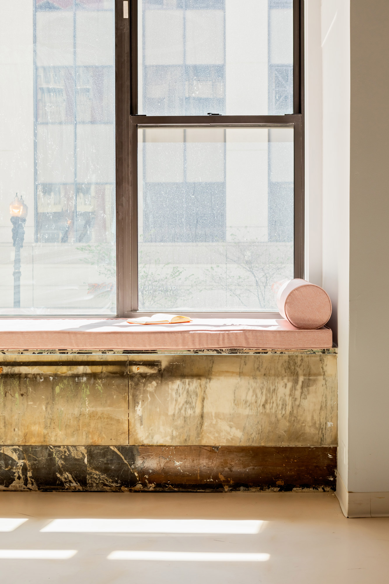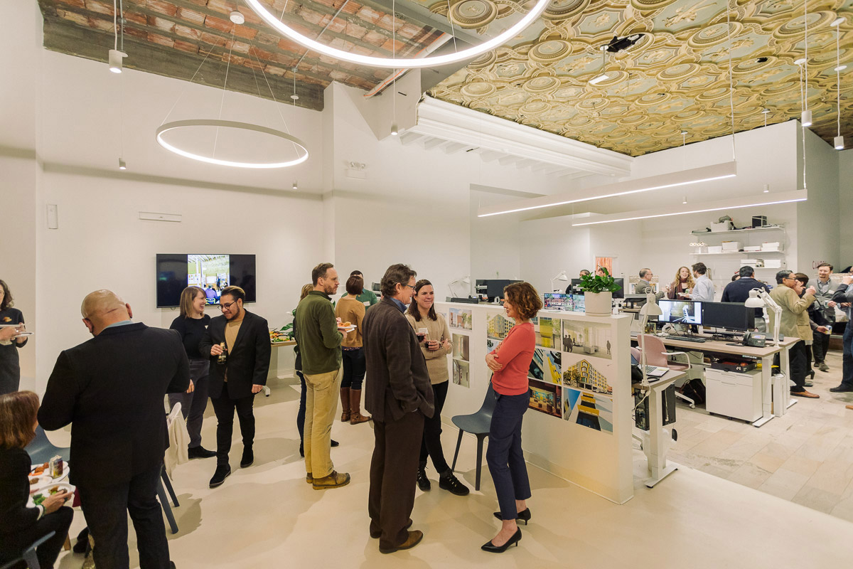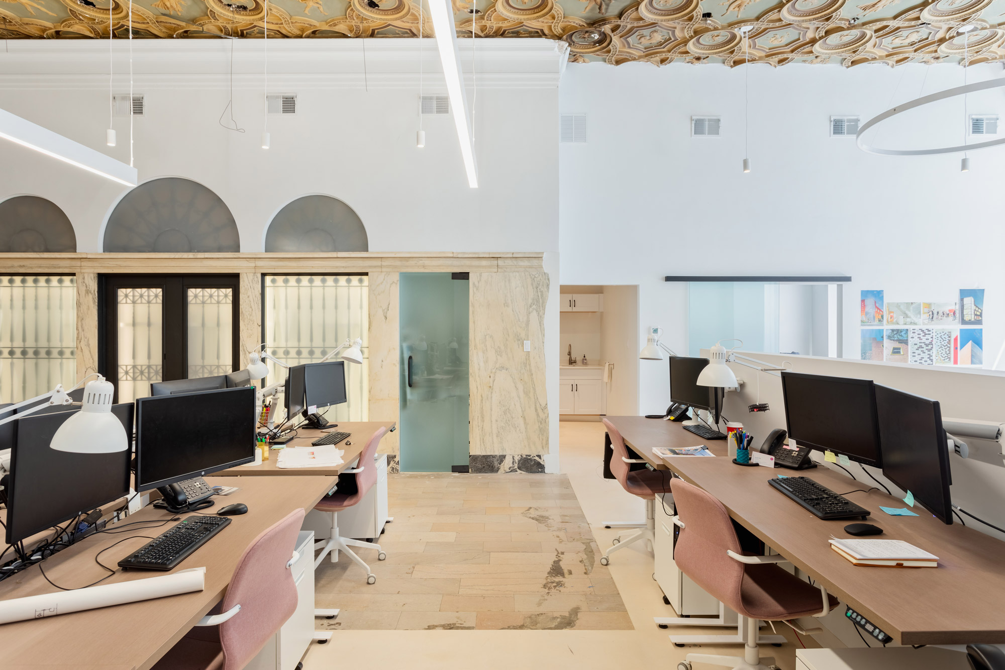 During demolition, new surprises continued to emerge: original marble floors, window surrounds, celebrated archways and other artifacts—hidden behind other surfaces. Plaster moldings with mythological creatures, wrought iron grilles, etc.—we have only begun to understand each found element. Structural concrete, fire clay tile and steel collar ties are purposely left exposed. Continuing to balance historic and modern elements: polished concrete, new LED lighting to celebrate the original architectonics, all new furniture and components that are simple and soft with natural tones (white, rose, sand, faded blue) and complementary to the existing space. We designed the space to promote collaboration and flexibility with a large flexible conference / seminar area, adjustable standing desks, window nooks, a reference library and model making area, as well as other informal seating and working zones.