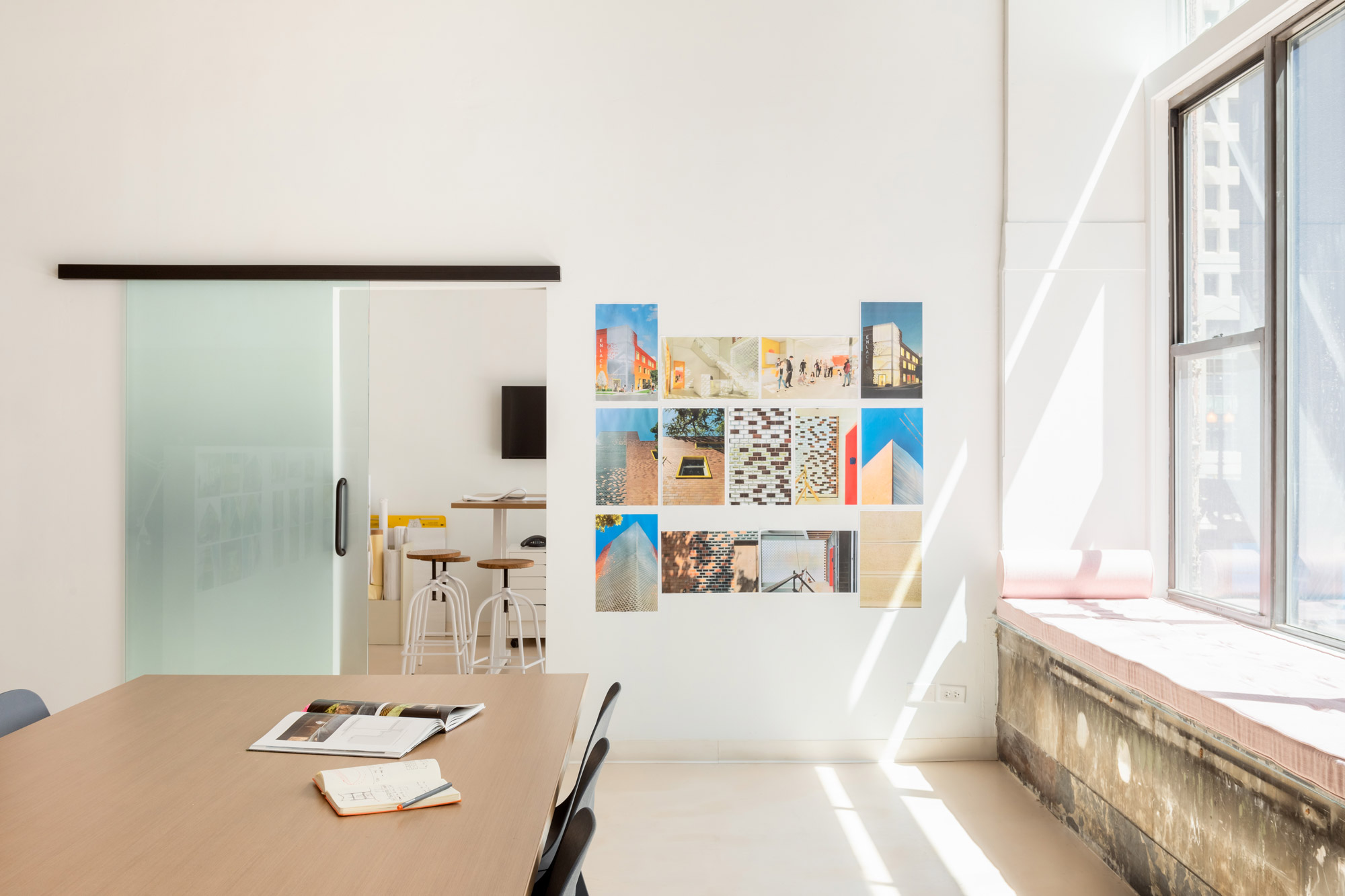 “The Studio” is a new 1,700 square-foot architecture studio located on the second floor of The Equitable Building, a Beaux Arts style building designed by Paul Hyland and Redmond Corse, built in 1927. At first sight of the existing space, a run-down space draped with heavy dropped ceilings and dated carpeting, etc., the landlord suggested there might be original 1920’s details buried beneath. We quickly jumped at the opportunity to reawaken original details and ornament not seen in decades and balance them with new elements as much as possible. Symbolic of our firm’s commitment to sustainability through preservation, we see this project as a reflection of our sensibilities to honor the past, present and future in our work.
